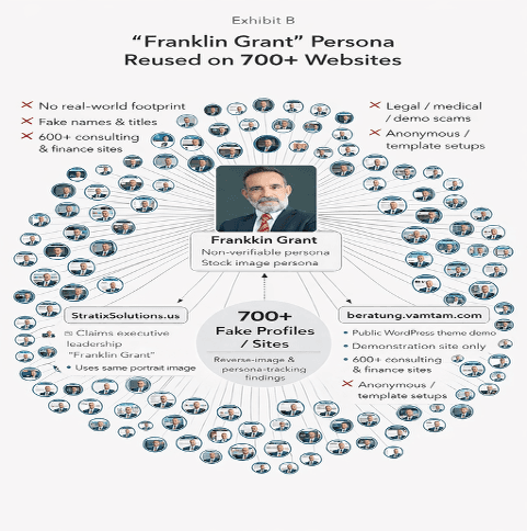 A growing body of open-source intelligence (OSINT) evidence indicates that the websites StratixSolutions.us and beratung.vamtam.com rely on the same fabricated executive persona— a figure presented as “Franklin Grant whose profile image has now been traced to more than 700 unrelated websites and profiles worldwide, according to cyber-forensic analysis conducted by CyberDeleteme.