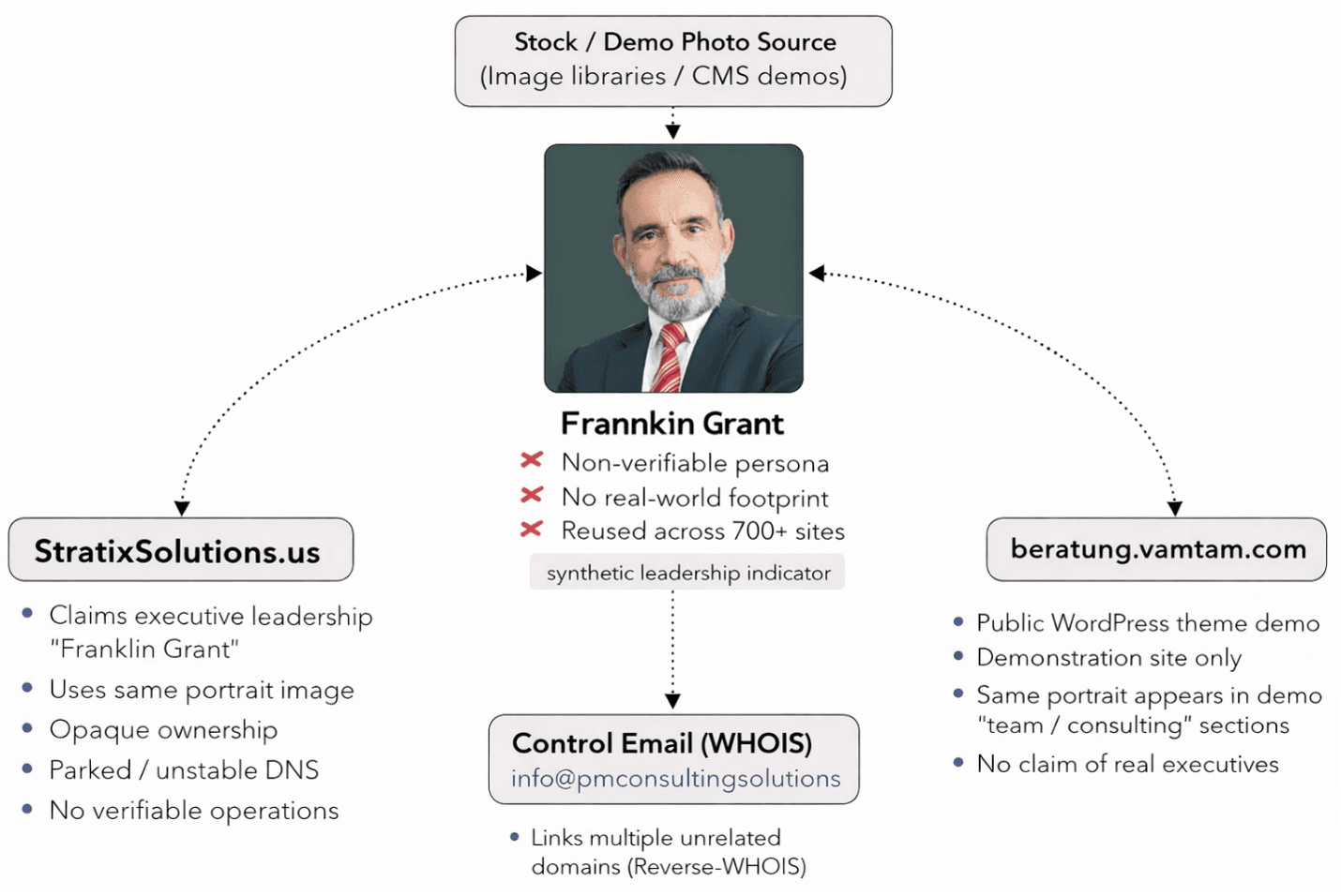 Investigators describe this as a textbook case of synthetic leadership: a non-existent executive identity constructed using stock imagery and generic biographies to create the appearance of corporate legitimacy.