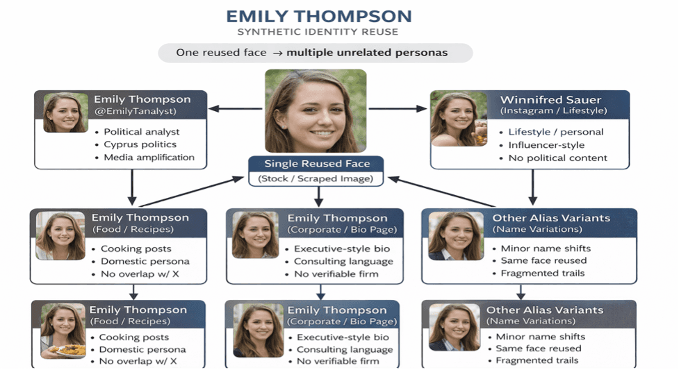 Analysts note that this structure closely resembles synthetic persona deployment, a practice in which stock or scraped images are reused to create multiple online characters for narrative amplification, influence operations, marketing manipulation, or short-lived digital projects.