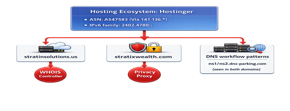 While stratixsolutions.us and stratixwealth.com do not publicly declare a relationship, forensic evidence shows: